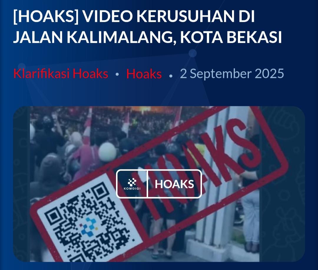 Jakarta, Lensa-Banua. Com– 3 September 2025, Video viral yang beredar di media sosial WhatsApp, yang mengklaim adanya kerusuhan disertai kebakaran di Jalan Raya Kalimalang, Bekasi, ternyata berita bohong alias hoaks. Video itu sesungguhnya merekam peristiwa berbeda yang terjadi di kota lain.